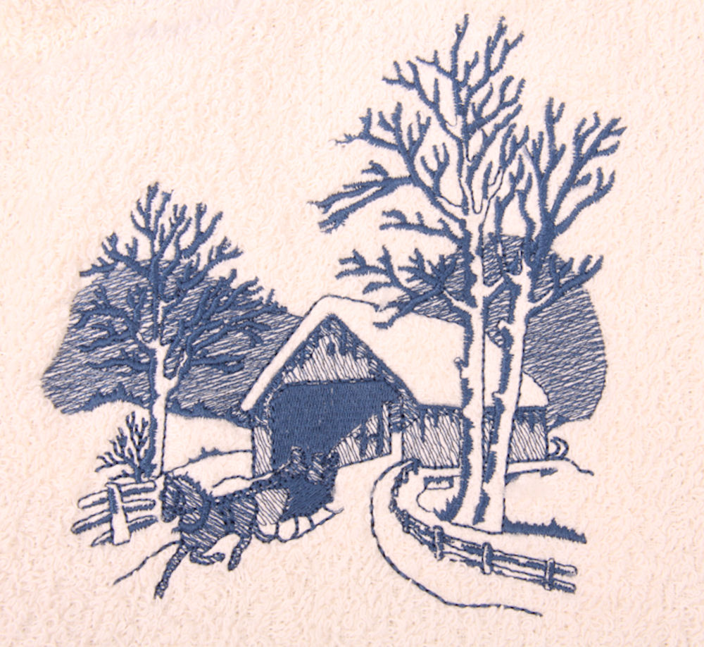 Covered Bridge and Horse Sleigh on Embroidered Bath Towels