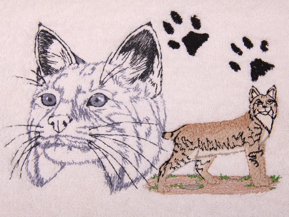 Bobcat with Paw Prints on Embroidered Bath Towels