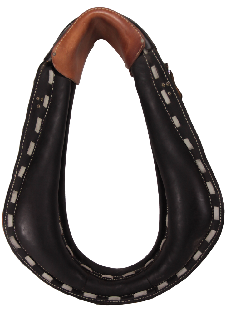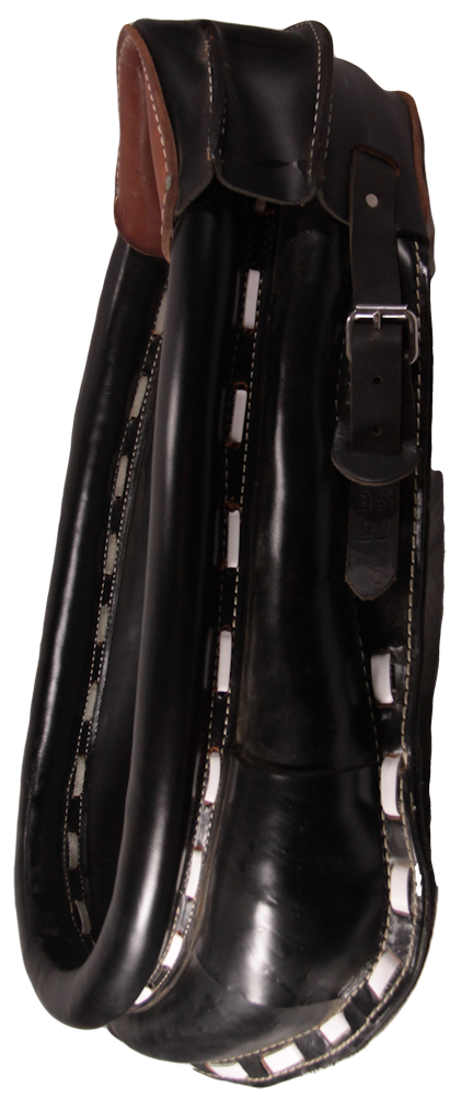 Adjustable draft horse work collar is made with a black assorted full grain leather on back and rim. The face is made of smooth full grain leather. This field collar is double stitched with a white leather laced out seam. Collar has an adjustable cap which gives you 3 sizes in one collar. For example, a 21″ – 23″ collar adjusts from 21″ to 23″.