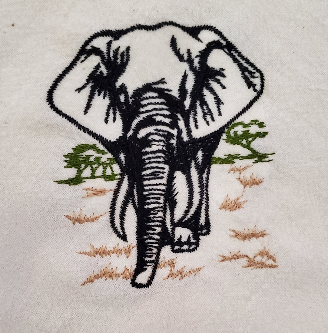 The flour sack dish towel is 100% white cotton. The actual size 30 X 30 inches. The corner has custom embroidered African Elephant design.