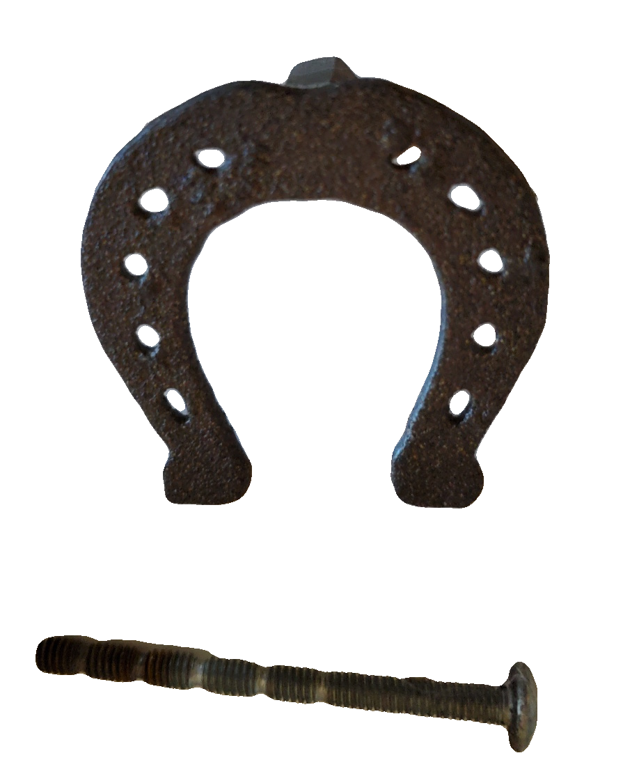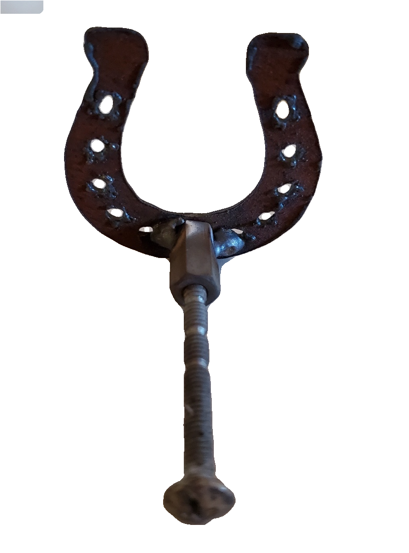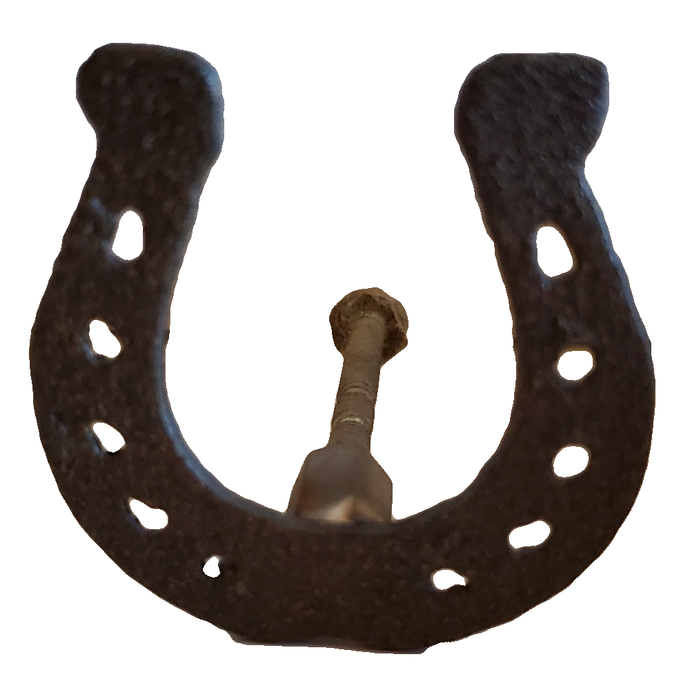 This is an antique brown metal horseshoe drawer pull. The horseshoe is about 2 inches long and 2 inches wide. The screw is about 2 inches long with a Phillips head. Quantities are limited.