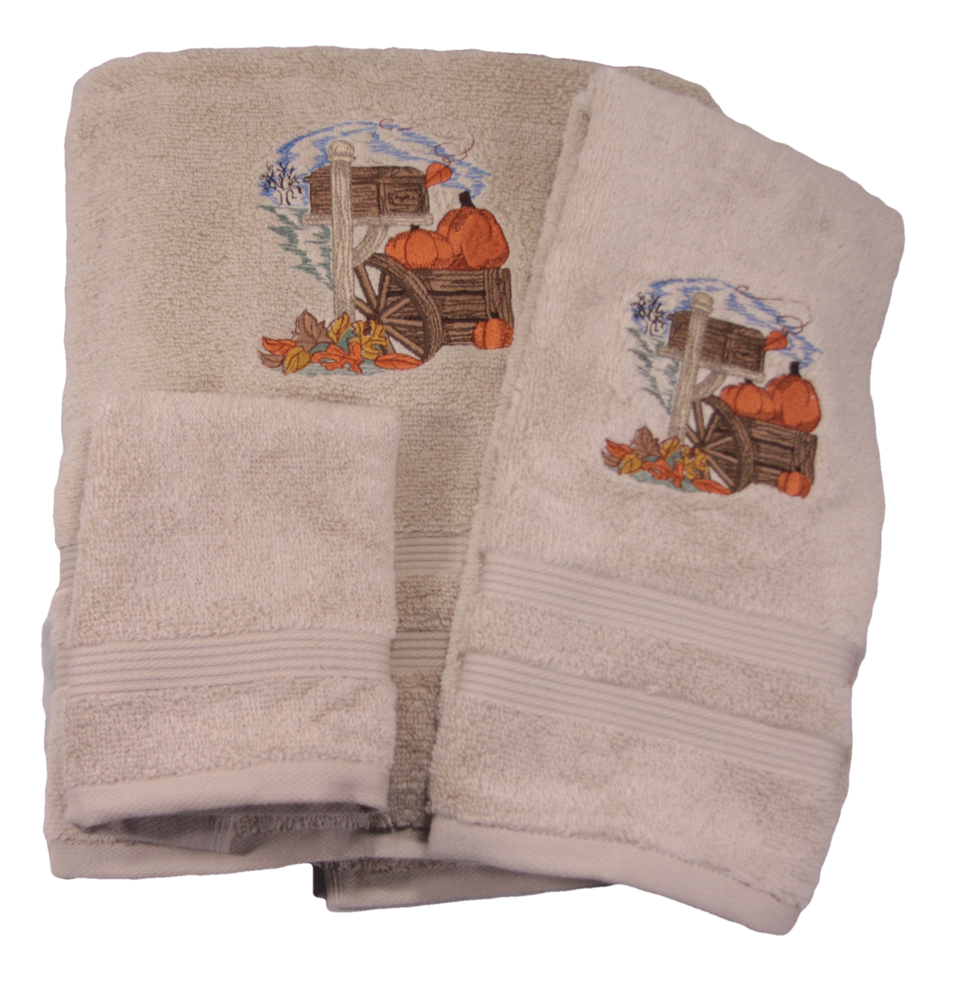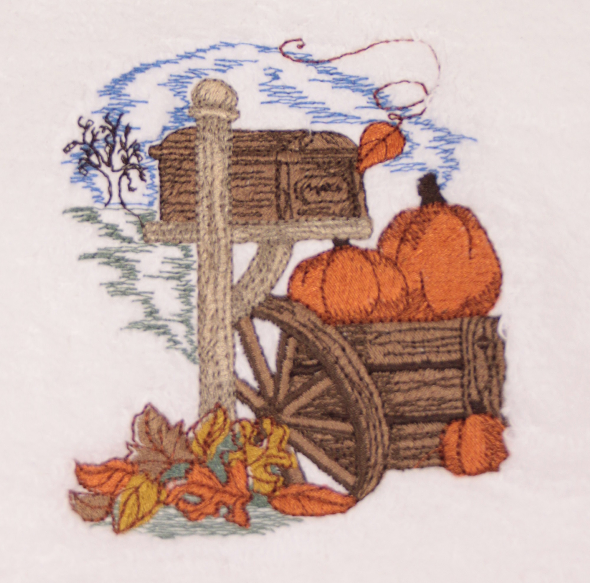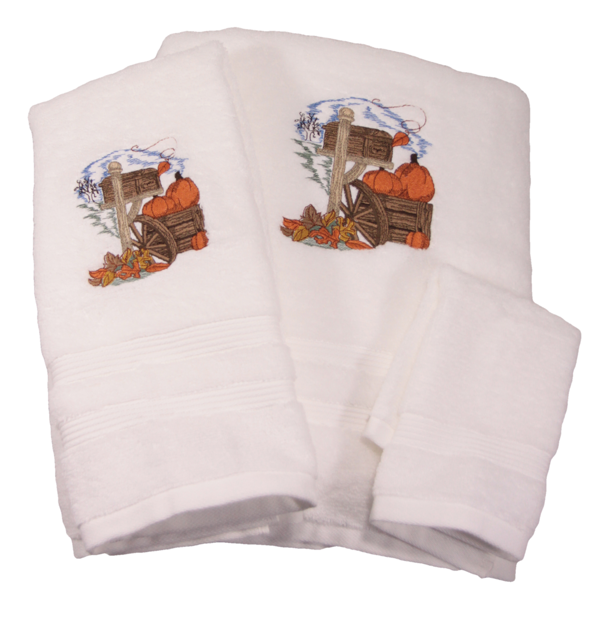 Embroidered bath towels featuring an embroidered fall design with pumpkins, leaves, wagon wheel and a mailbox. Designs are done on a soft, 100% cotton terry. Autumn Pumpkins and Leaves Mailbox Embroidered Bath Towels are a medium weight terry for best appearance of the embroidery. Designs are sewn in long lasting polyester thread.
