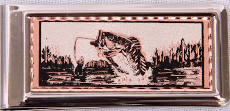 Metal money clip with etched design of fisherman catching a bass.
