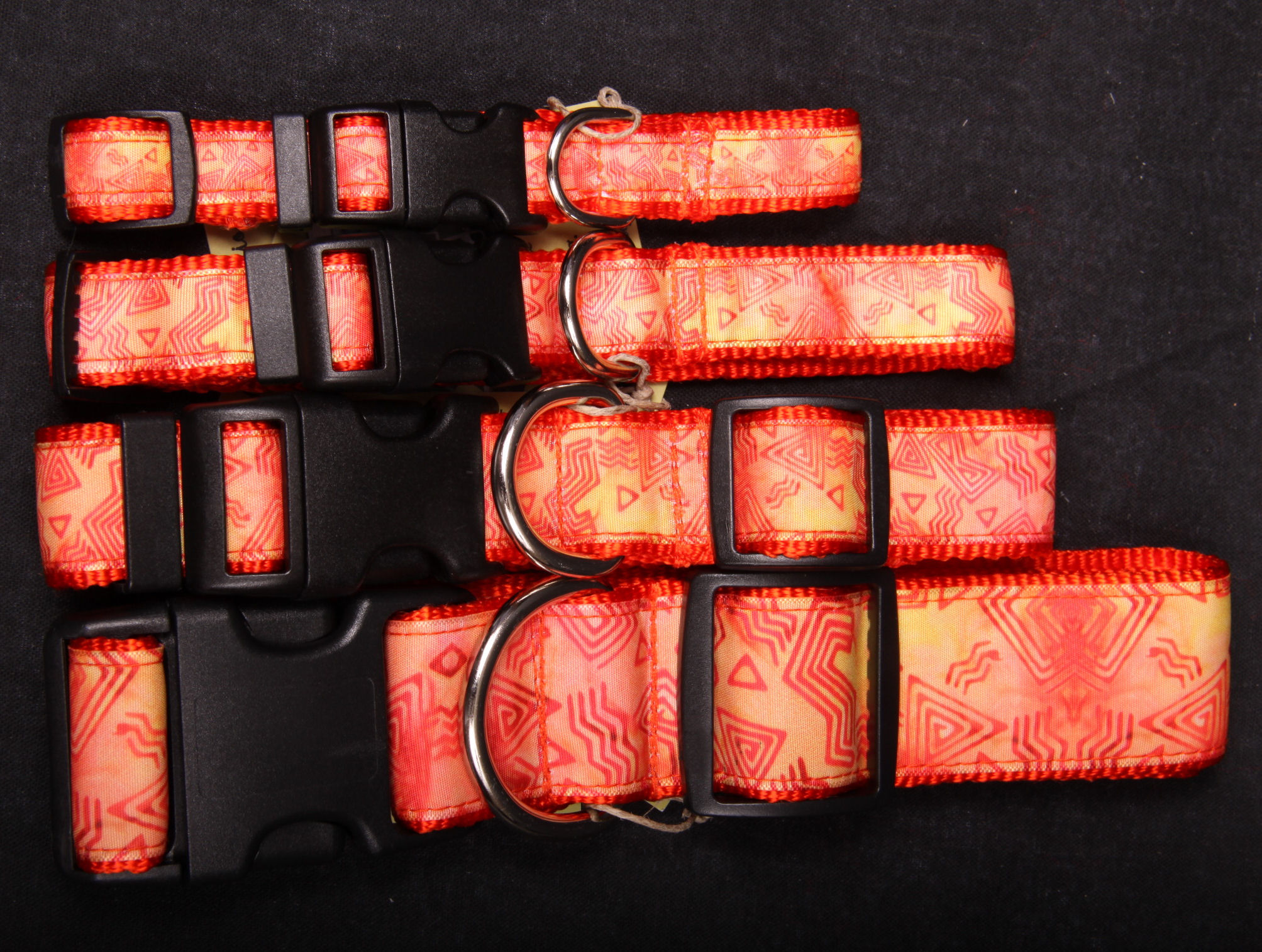 Unique batik designed dog collars are created by transferring batik fabric designs on ribbon that is sewn on soft nylon. The soft nylon is durable but won’t irritate your dog’s skin. The collars are adjustable and have metal D ring to attach a leash. Collars have a side release buckle. Matching leads are available. Washable.