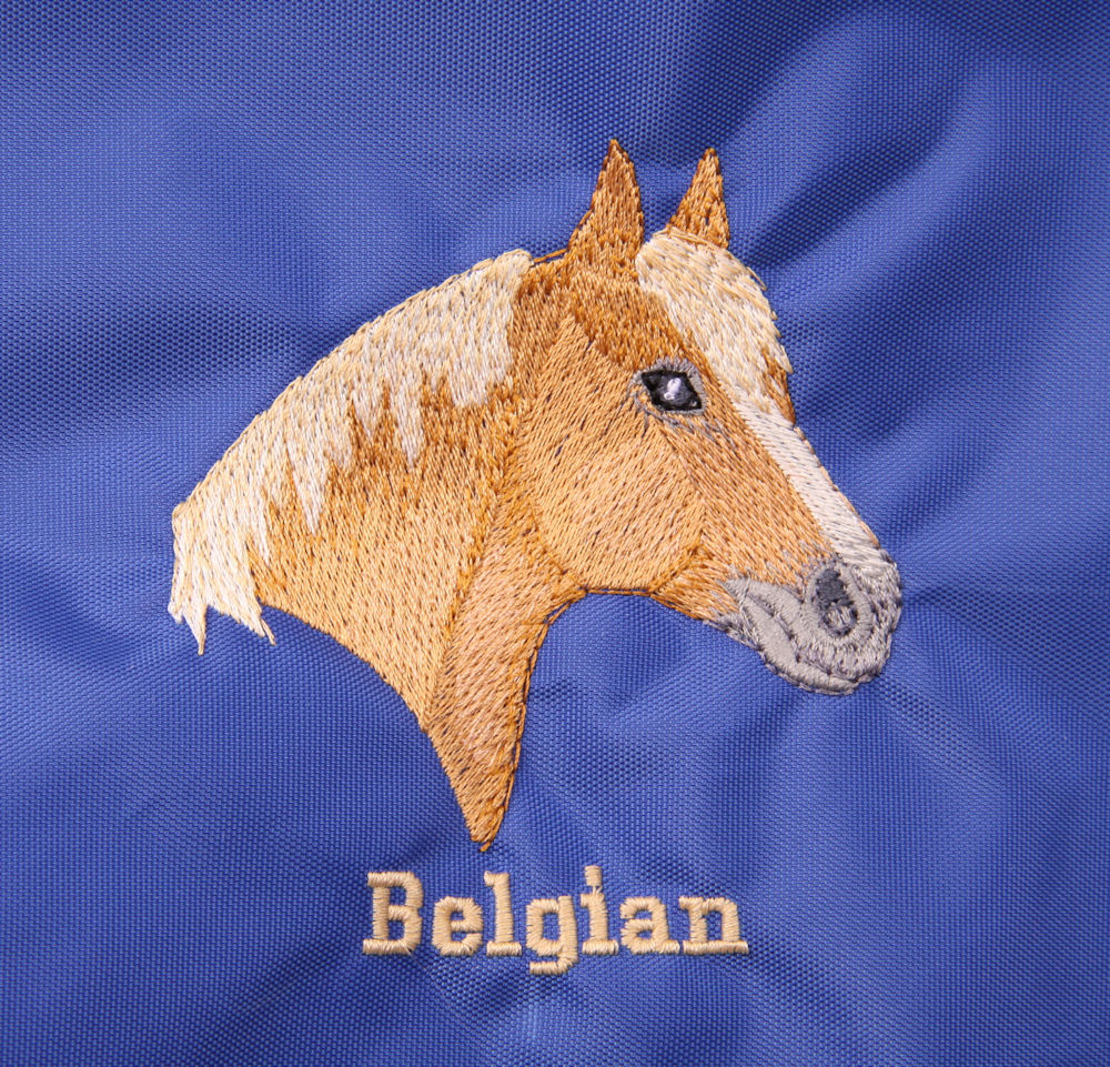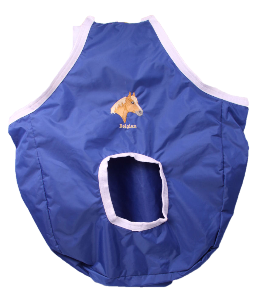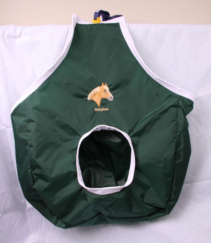 This is a draft horse size hay bag. Hay bag is made of heavy duty nylon with white braid trim. Custom embroidered on the front is a Belgian horse head. The hay bag opens at the top and there are two metal rings for hanging the bag.