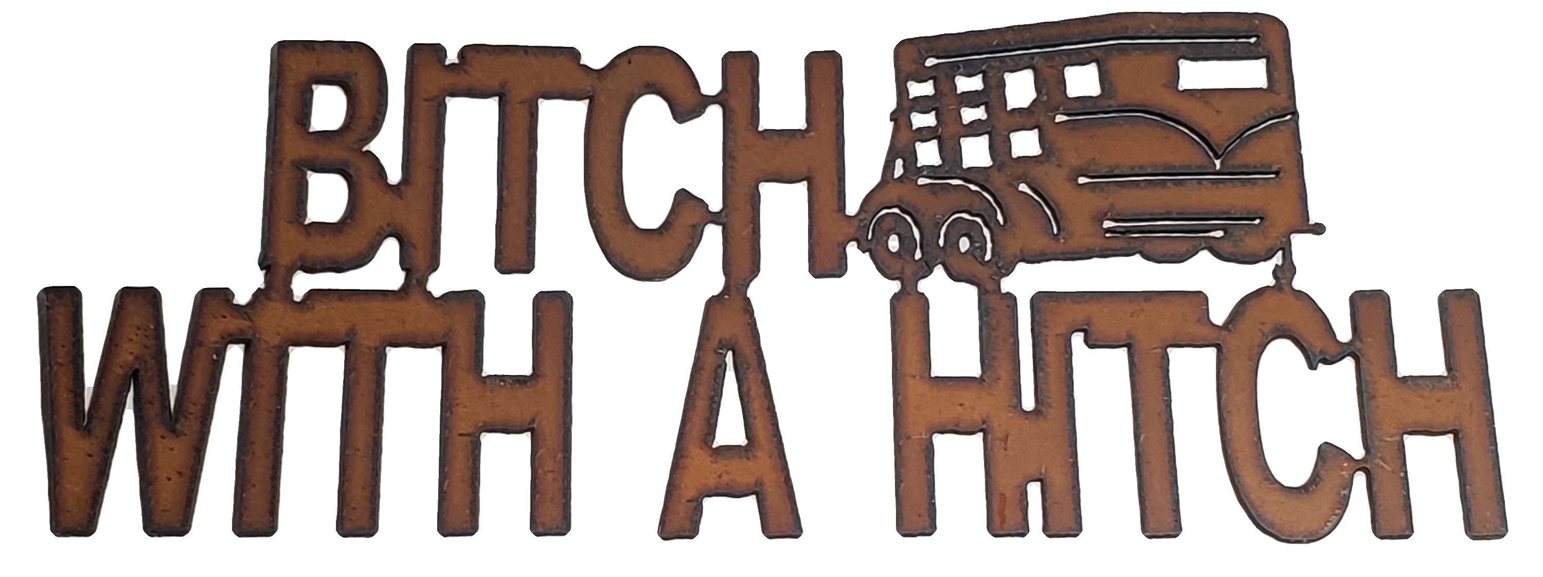 Rustic metal sign features the words “Bitch with a Hitch” and a horse trailer. Actual size is about 6 inches x 14 inches. Unique sign for your barn or home.