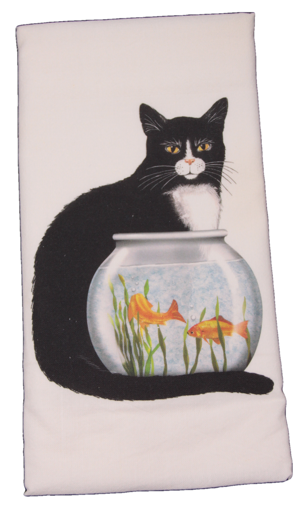 Black and White Cat with Fish Bowl Printed Flour Sack Dish Towel