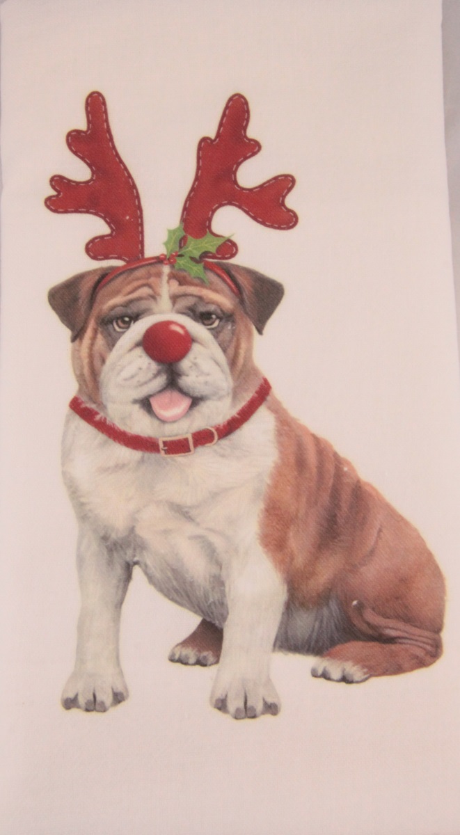 The flour sack dish towel is 100% white cotton. The actual size 30 X 30 inches. The towel has a printed design featuring a Black Labrador wearing a pine wreath. The beautiful design is done by artist Mary Lake-Thompson. Great for drying dishes and cleaning up! Machine wash cold in gentle cycle.