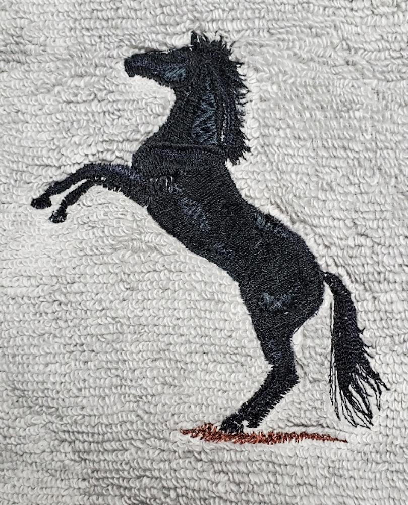 Embroidered bath towels featuring an embroidered Black Rearing Horse. Designs are on a soft, basic, 100% cotton terry bath towel set. Towels are a medium weight terry for best appearance of the embroidery. Designs are sewn in long lasting polyester thread.