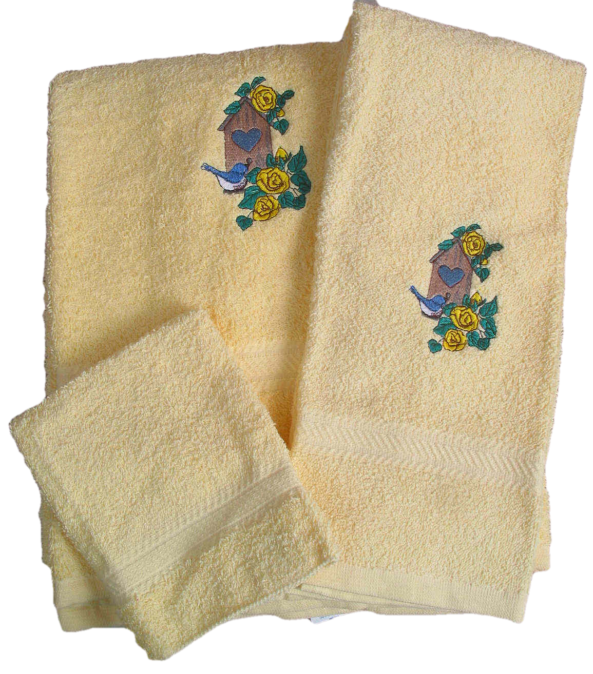 Bath towel set featuring an embroidered Blue Bird & Birdhouse. Designs are done on a soft, 100% cotton terry. Towels are a medium weight terry for best appearance of the embroidery. Designs are sewn in long lasting polyester thread.