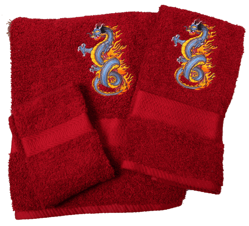 Embroidered bath towels featuring an embroidered blue dragon design. Towels are 100% soft, basic cotton terry. Towels are a medium weight terry for best appearance of the embroidery. Designs are sewn in long lasting polyester thread.