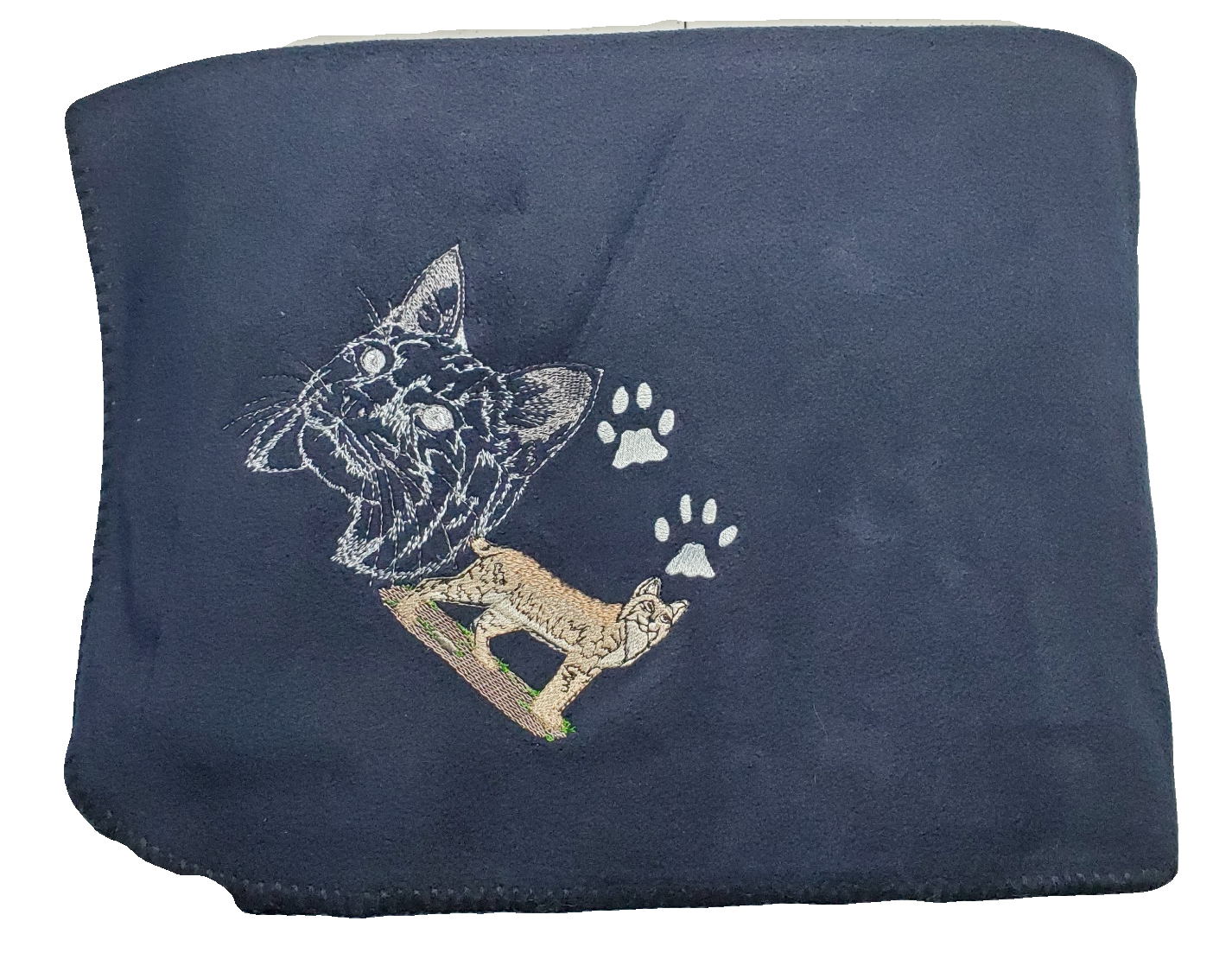 Custom embroidered Bobcat with paw print design on 100% Polyester warm fleece throw. The design is sewn with color fast polyester thread. The approximate size 50 x 60 inches. Machine washable.