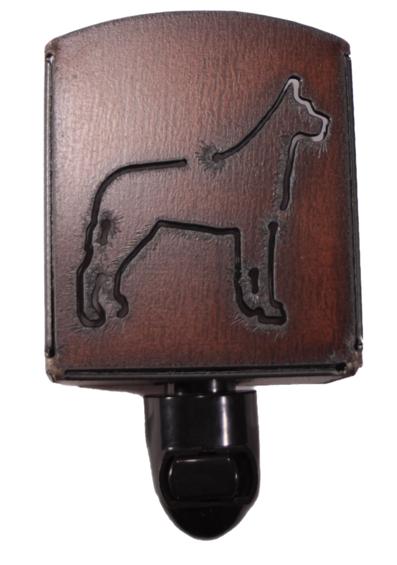 Brown rustic metal night light has the outline of a Great Dane dog. The night light top is 3 1/4″ x 3 5/8″ and the overall height is 5 1/4″. Light bulb is included.