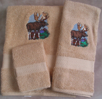 Embroidered bath towels featuring an embroidered Bull Moose. Designs are on a soft, basic, 100% cotton terry bath towel set. Towels are a medium weight terry for best appearance of the embroidery. Designs are sewn in long lasting polyester thread.