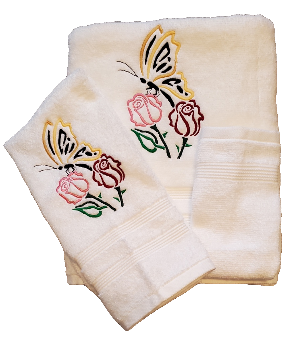 Embroidered bath towels featuring an embroidered outline of a butterfly and rose. Designs are on a soft, basic, 100% cotton terry bath towel set. Towels are a medium weight terry for best appearance of the embroidery. Designs are sewn in long lasting polyester thread.