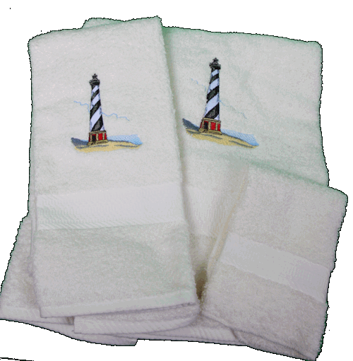 Embroidered bath towels featuring an embroidered Hatteras Lighthouse. Soft, basic, 100% cotton terry bath towel set. Towels are a medium weight terry for best appearance of the embroidery. The design is embroidered with long lasting color fast polyester thread.