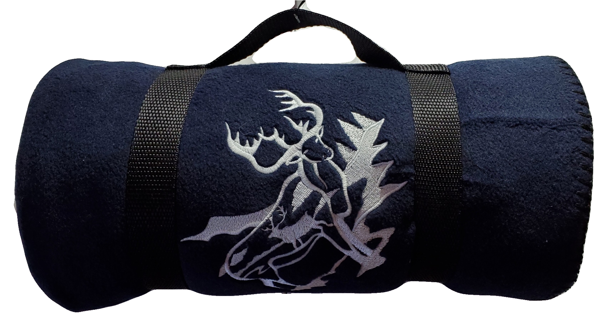 Custom embroidered Caribou Outline on 100% Polyester warm fleece throw. The design is sewn with color fast polyester thread. The approximate size 50 x 60 inches. Comes with black strap carrying handle. Machine washable.