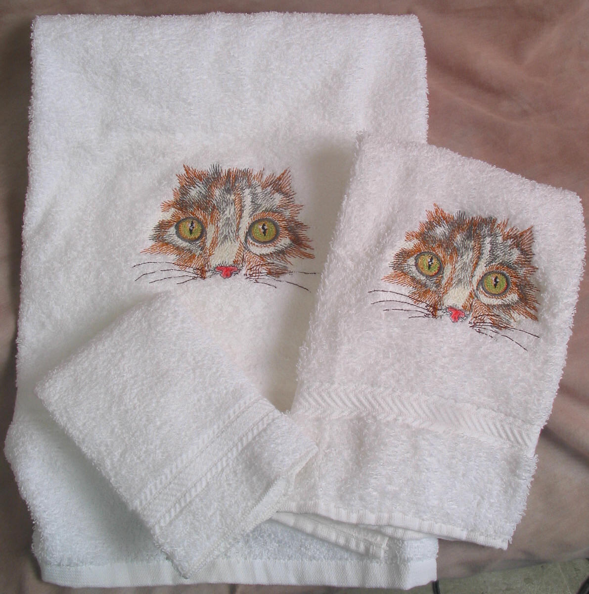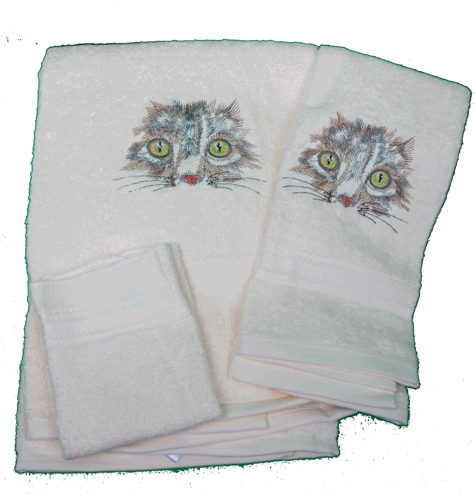 Embroidered bath towels featuring an embroidered Cat Face. Designs are on a soft, basic, 100% cotton terry bath towel set. Towels are a medium weight terry for best appearance of the embroidery. Designs are sewn in long lasting polyester thread.