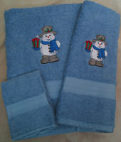 Embroidered bath towels featuring an embroidered Christmas Snowman With Present. Designs are on a soft, basic, 100% cotton terry bath towel set. Towels are a medium weight terry for best appearance of the embroidery. Designs are sewn in long lasting polyester thread.