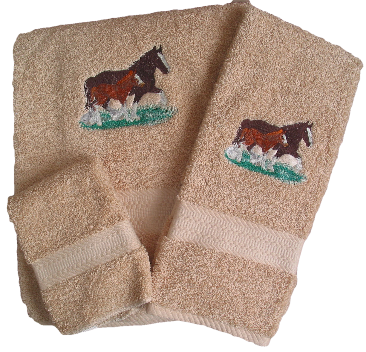 Embroidered bath towels featuring an embroidered Clydesdale Horse Mare & Foal. Towels are 100% soft cotton, basic terry. Towels are a medium weight terry for best appearance of the embroidery. Designs are sewn with long lasting polyester thread.