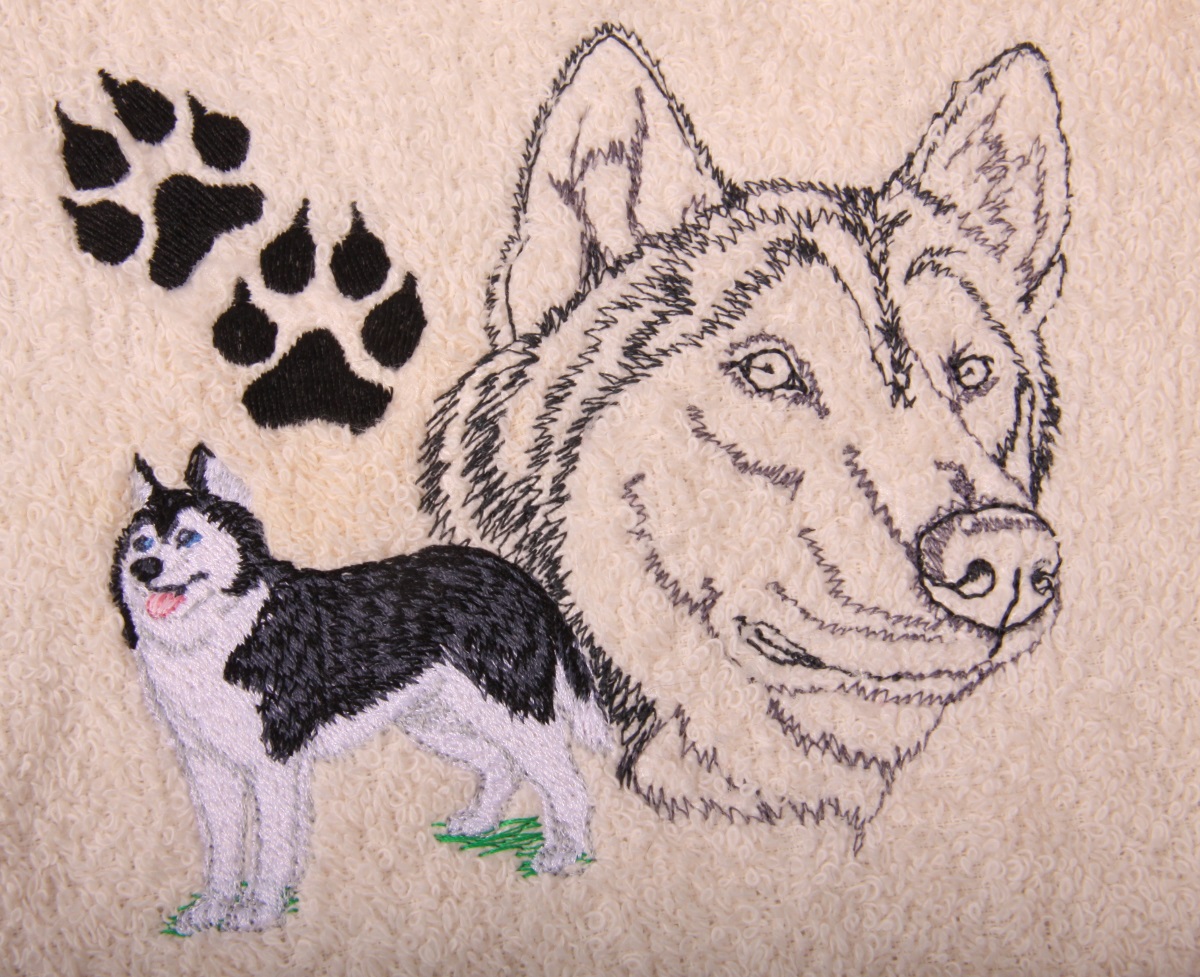 Embroidered bath towels feature a Cocker Spaniel dog design. Towels are 100% soft cotton, basic terry. Towels are a medium weight terry for best appearance of the embroidery. Designs are sewn in long lasting polyester thread.