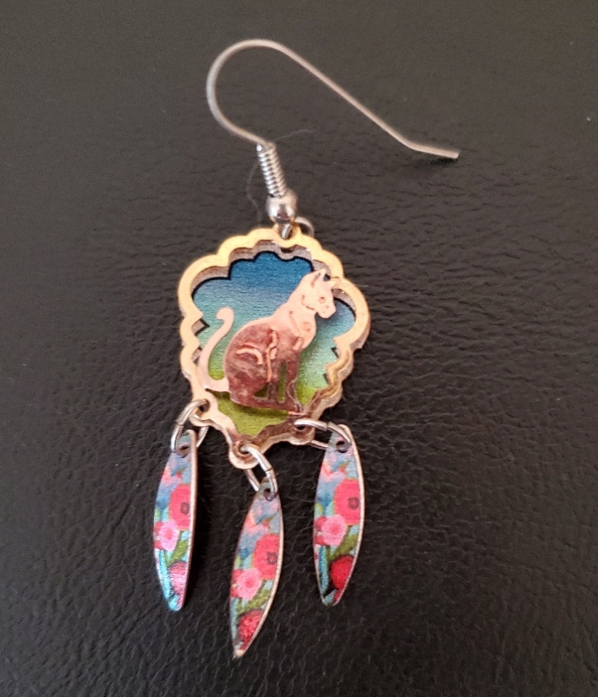 Copper drop earrings are a diamond shape with a sitting cat and feathers. Pierced earrings have surgical steel wire loop. Drop is about 2 1/4 inches and width is about 3/4 inch. Hand crafted, design by Tony. Earrings are protected by clear lacquer finish so they do not require polishing.