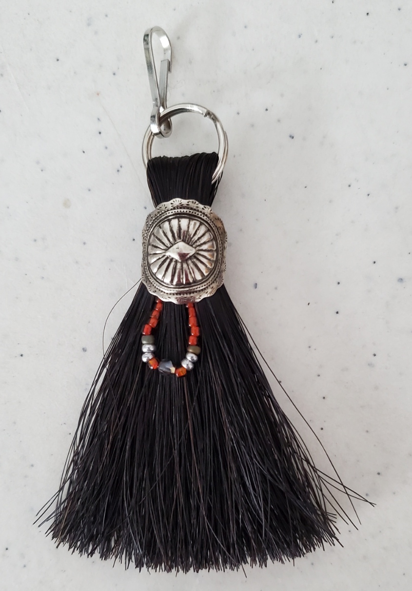 This zipper pull is made of horse hair and has a beaded decoration.  Includes a hook to attach to a zipper on a purse, jacket, backpack or other items.  Comes in three basic colors but horse hair color does vary.