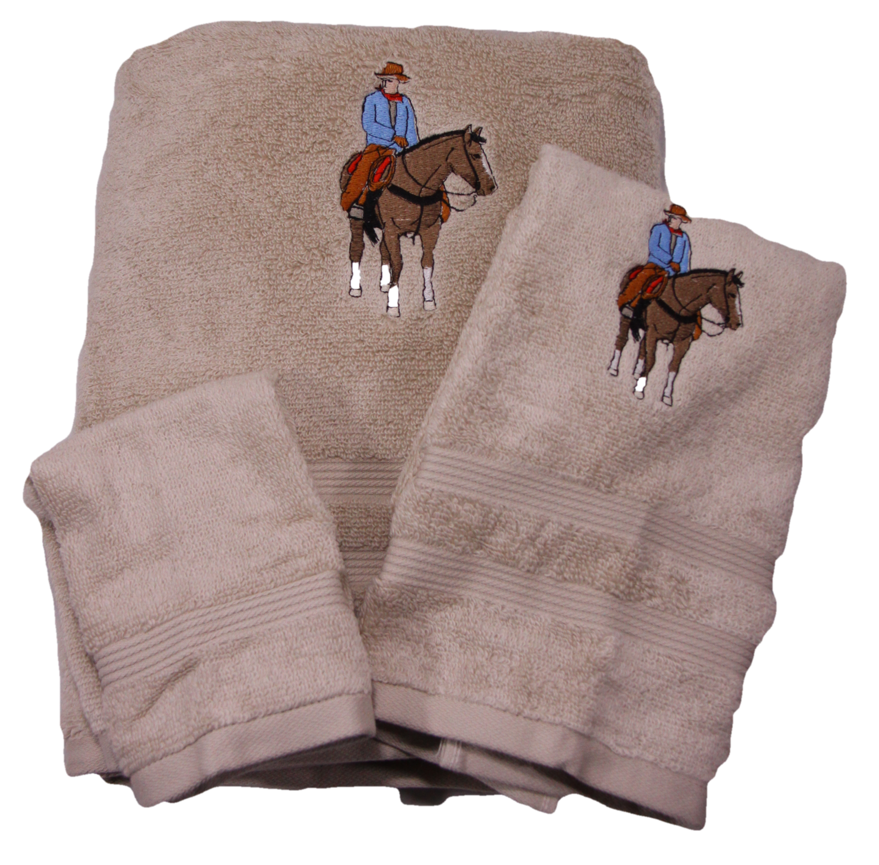 Embroidered bath towels featuring an embroidered cowboy on Western horse design. Designs are on a soft, basic, 100% cotton terry bath towel set. Towels are a medium weight terry for best appearance of the embroidery. Designs are sewn in long lasting polyester thread.