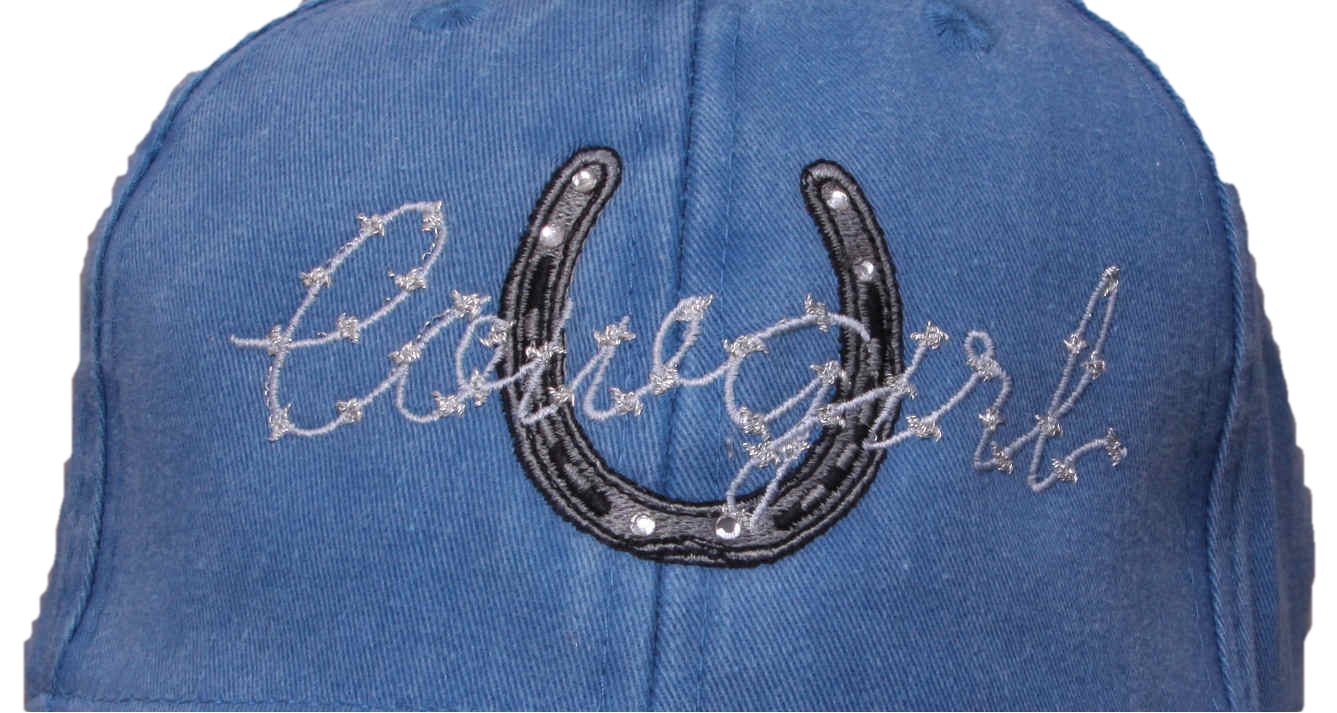 Cowgirl cap with Horse Shoe in 100% cotton twill with metal buckle. Horse shoe has crystal gem accents. Cap adjusts so one size fits most. Cap is available as solid color or with contrasting bill.