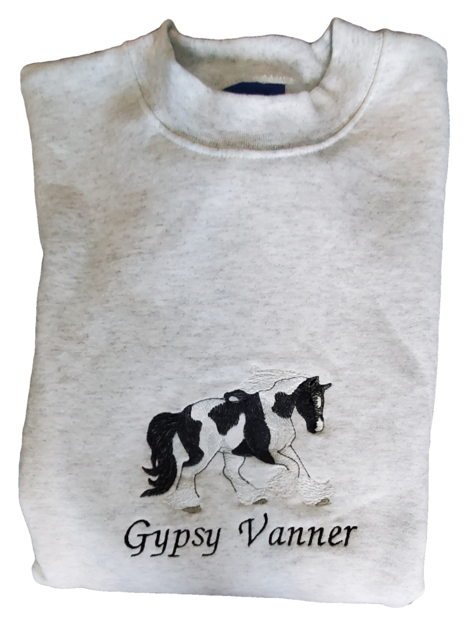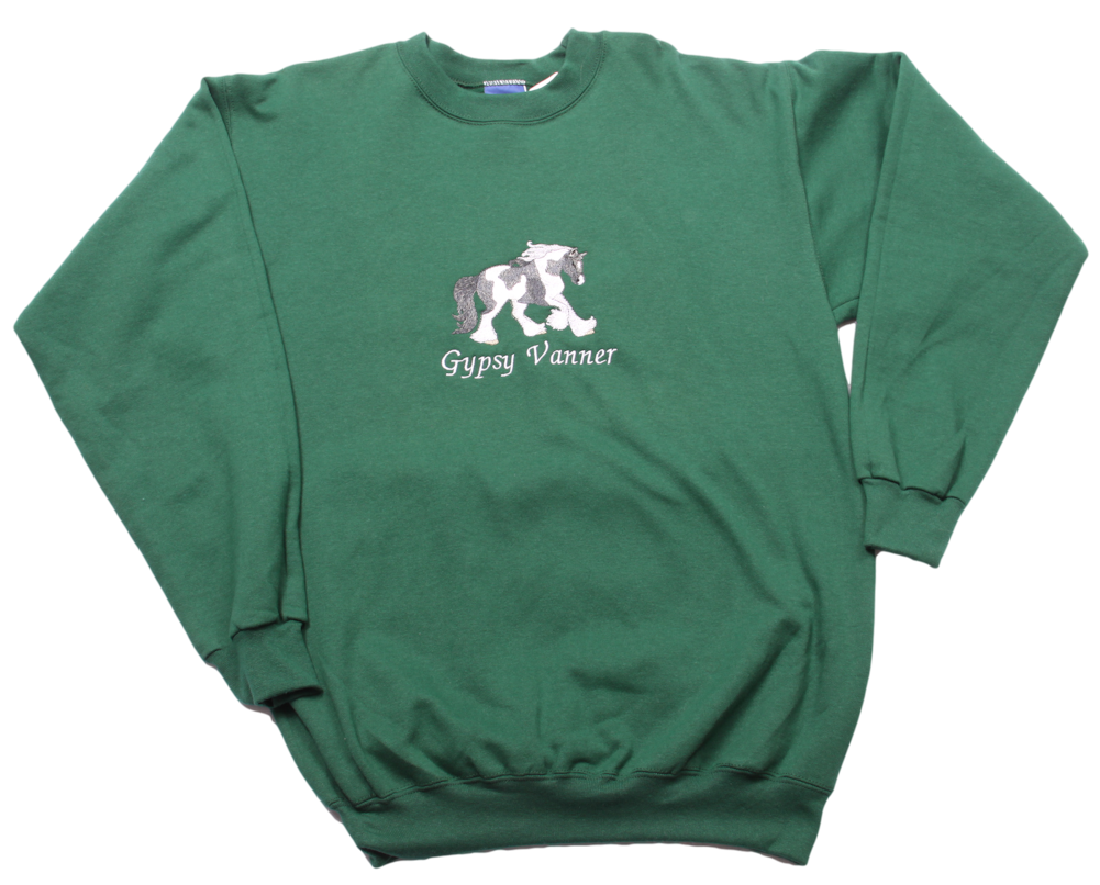 Our embroidered sweatshirts are knit made of 50% pre-shrunk cotton and 50% polyester. The sweatshirts are long sleeve with crew neck and ribbed bottom and cuffs. Embroidery is done with washable polyester thread. Design is a Gypsy Vanner horse.
