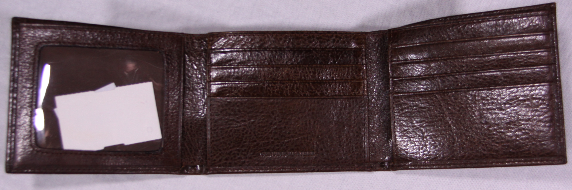 Dark Brown leather tri-fold wallet with smooth cover. Wallet is 3 1/2″ wide by 4 1/2″ long (closed). Open it is 13″ long and 3 1/2″ wide. Inside has eight pockets for cash and pockets for credit cards and an ID pocket with a clear window. There is also a lined cash pockets and two other side pockets.