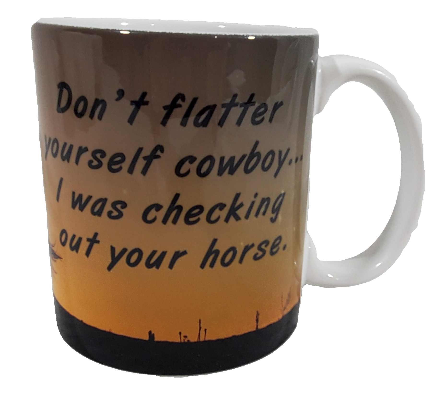 Ceramic mug features a cowboy and horse with the words “Don’t flatter yourself cowboy…I was checking out your horse”. The mug holds 11 oz. of liquid and is 3 3/4″ high. Microwave and dishwasher safe. Made in Thailand.