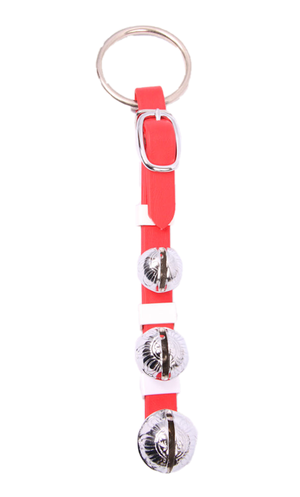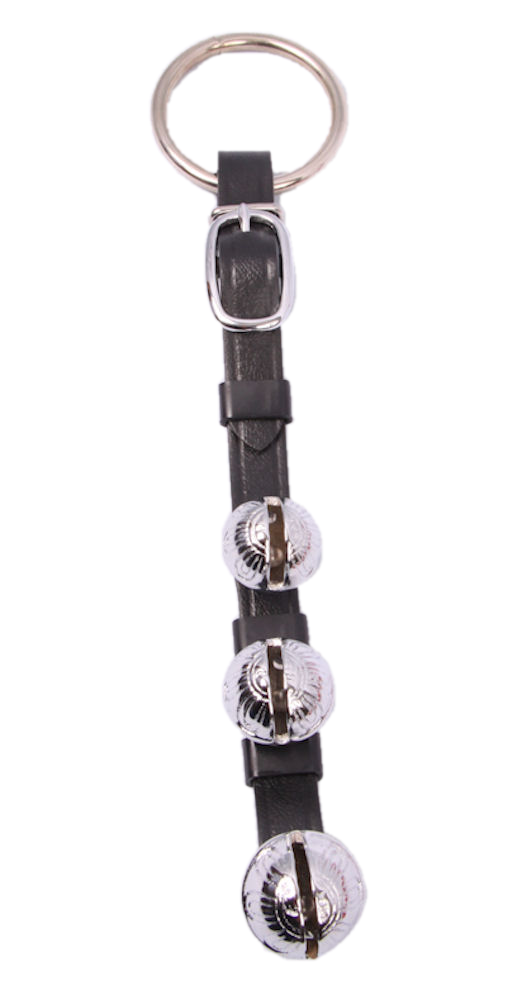Sleigh bell strap with 3 bells and 3/4 inch biothane/beta strap. Available with either brass or chrome plated bells and matching hardware. Ring is large enough to fit over a standard door knob.
