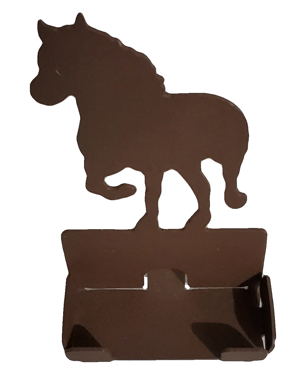 This business card holder features a trotting draft horse. Made of brown matte metal. Measures 7 inches tall and  4 inches wide.   Great desk accessory.
