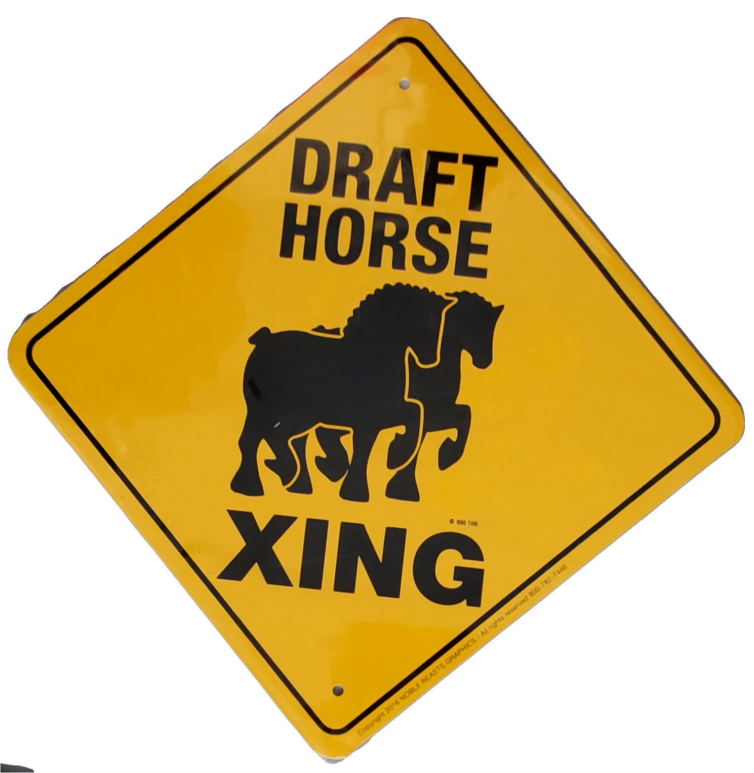 Draft Horse Crossing Sign Non-rusting aluminum road sign displays a team of draft horses. The sign reads Draft Horse Xing. Actual size is a 12 x 12 Inch diamond.