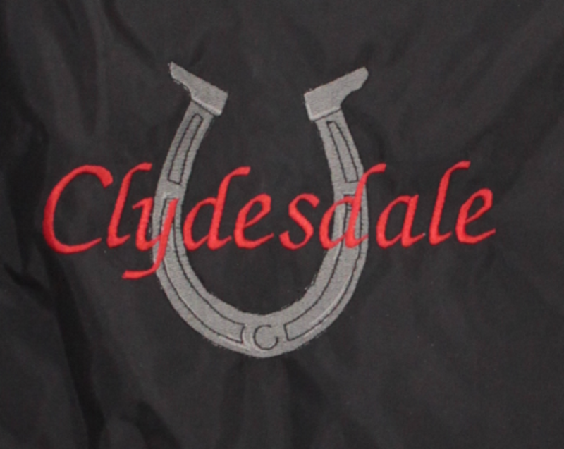 This is a draft horse size hay bag. Hay bag is made of heavy duty nylon with white braid trim. Custom embroidered on the front is a horseshoe with the name of a draft horse breed. The hay bag opens at the top and there are two metal rings for hanging the bag.