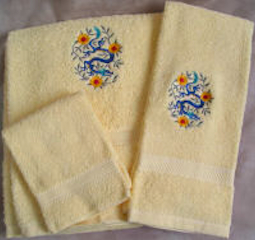 Embroidered bath towels featuring an embroidered Dragon & Flowers. Towels are 100% soft, basic cotton terry. Towels are a medium weight terry for best appearance of the embroidery. Designs are sewn in long lasting polyester thread.