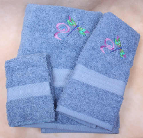 Embroidered bath towels featuring an embroidered Dragonfly with Swirl. Towels are 100% soft, basic cotton terry. Towels are a medium weight terry for best appearance of the embroidery. Designs are sewn in long lasting polyester thread.
