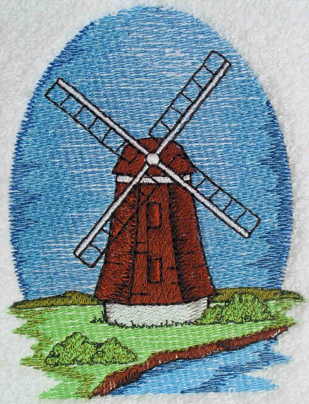 Dutch Country Windmill Embroidered Bath Towels. Towels are 100% cotton terry. Designs are sewn in long lasting polyester thread.