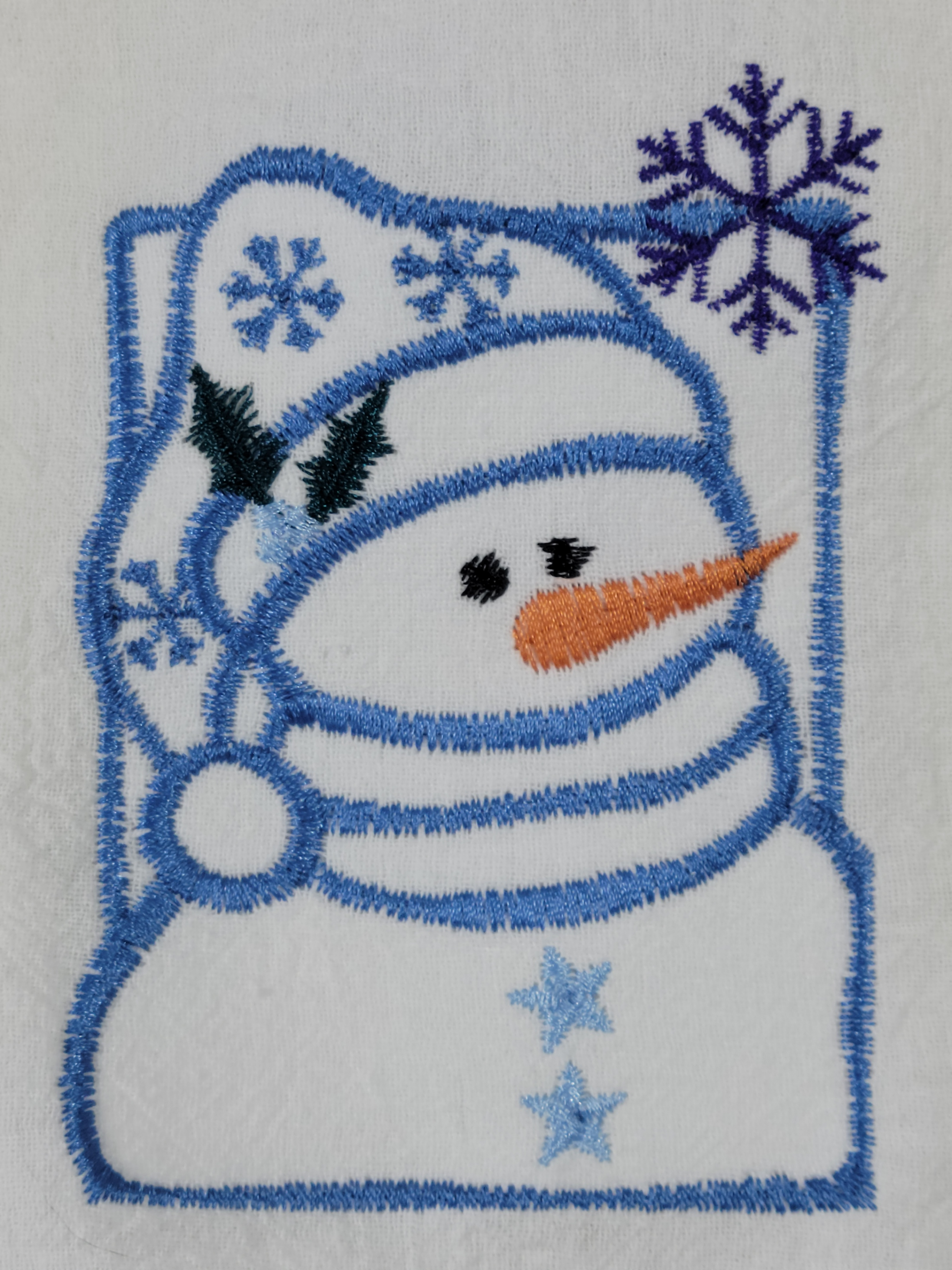 Embroidered Snow Man Flour Sack Dish Towel is made of 100% white cotton. The actual size 30 X 30 inches. The towel has a custom embroidered snowman with snow flakes. Unique gift.