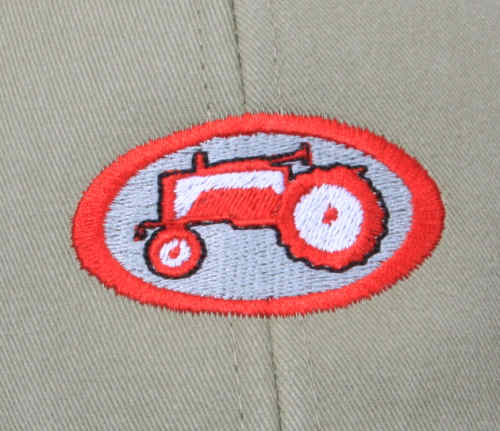 Vintage Embroidered Tractor Cap. Cap is 100% cotton twill with metal buckle. Cap adjusts so one size fits most. Available as solid color cap or with contrasting bill. Hat is decorated with a red or green tractor!