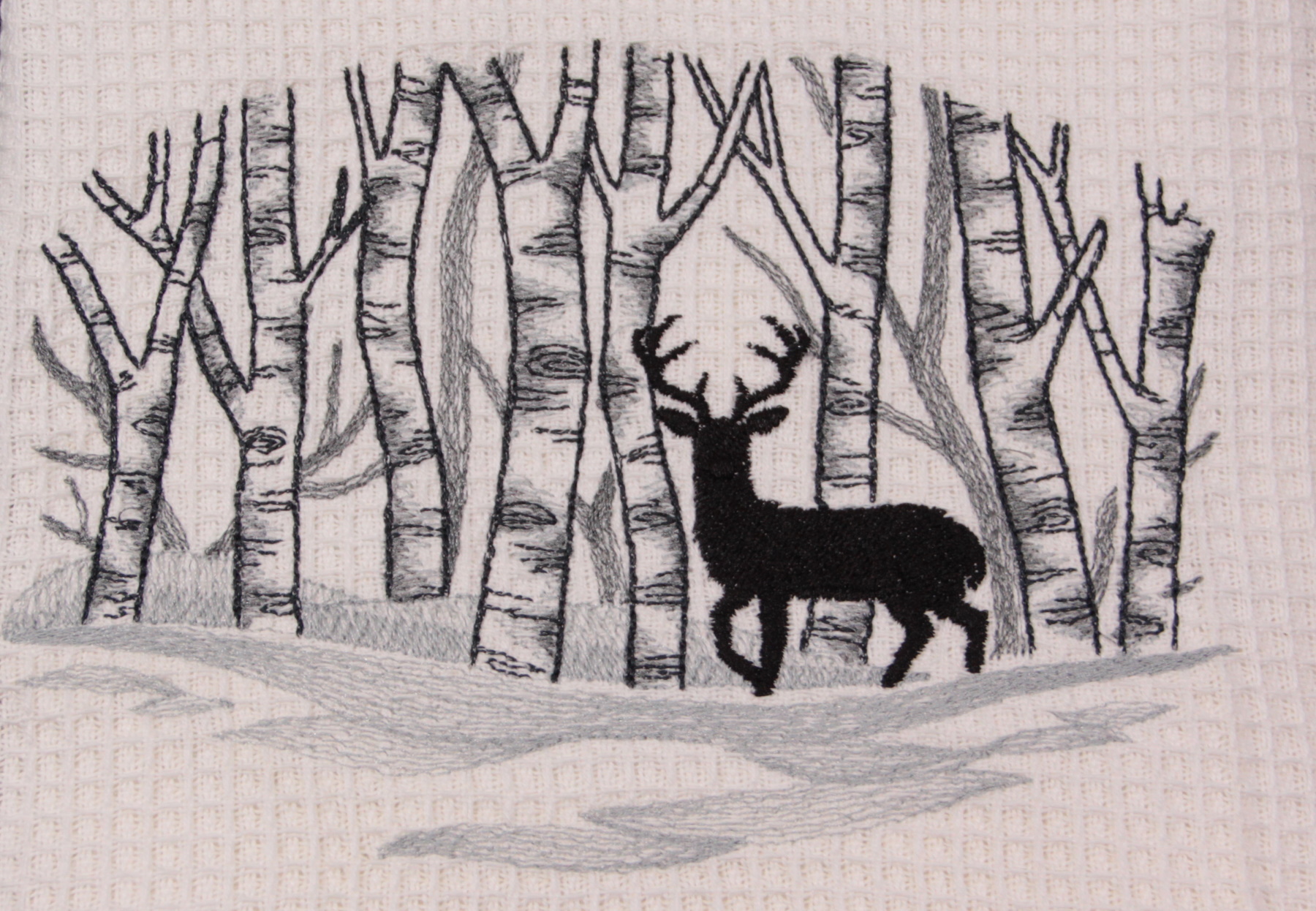 Embroidered White Waffle Weave Dish Towel – Deer in the Woods