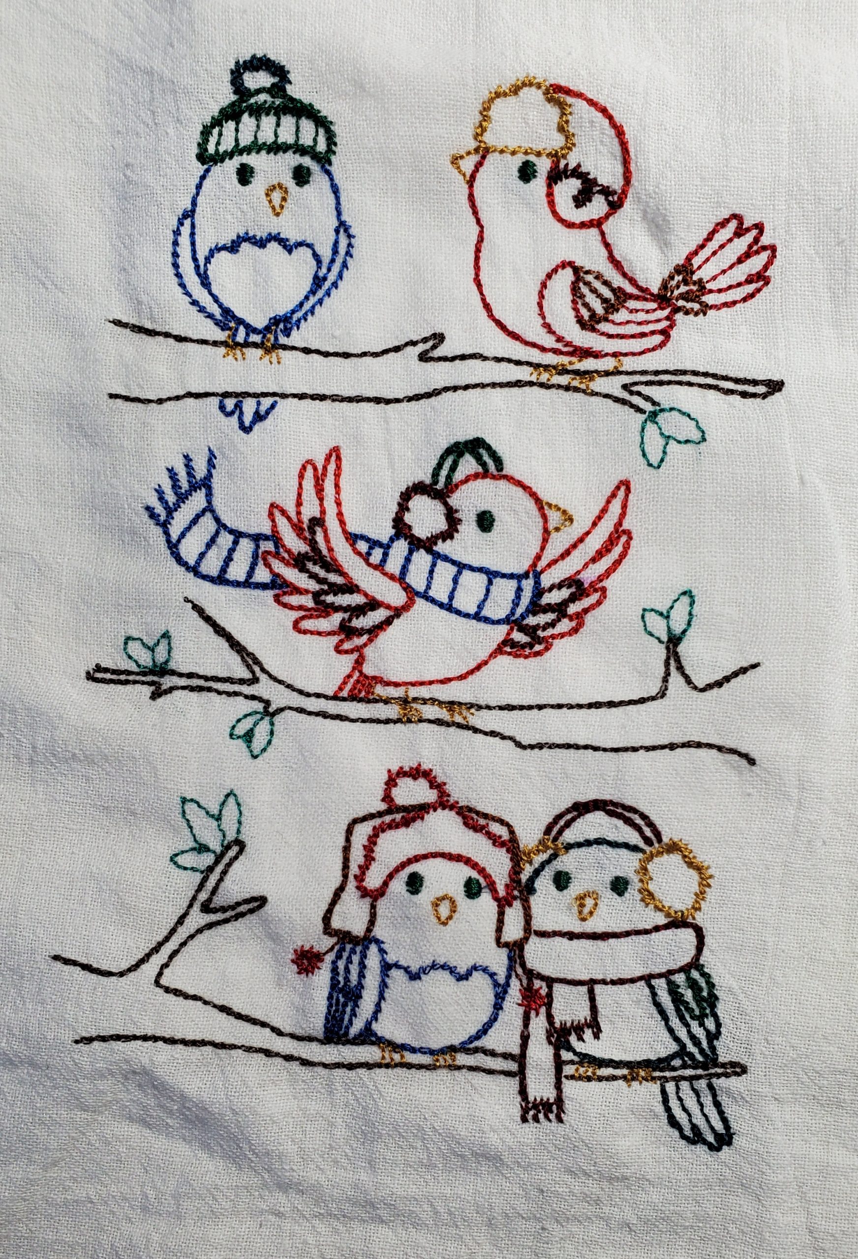 Embroidered winter birds with hats and scarfs on a Flour Sack Dish Towel. Towel is made of 100% white cotton. The actual size 30 X 30 inches. The design is called “Weathering Winter”. Unique gift.