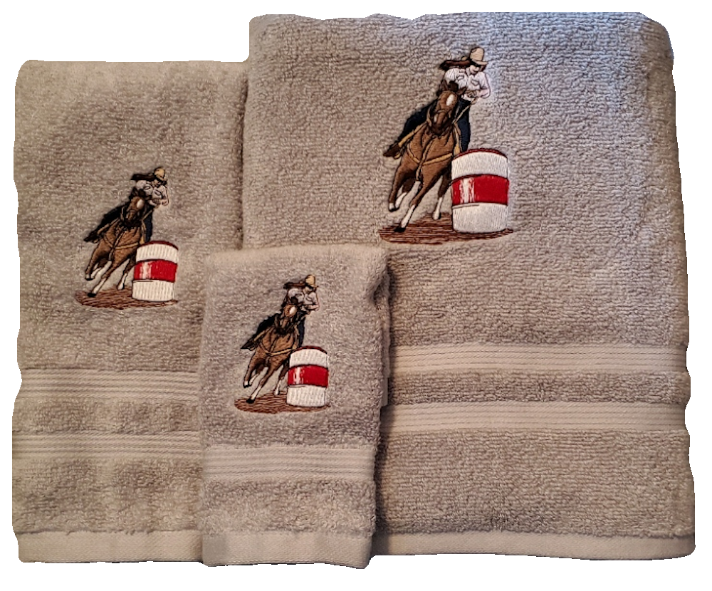 Embroidered bath towels featuring an embroidered female Barrel Racer Horse. Designs are done on a soft, 100% cotton terry. Towels are a medium weight terry for best appearance of the embroidery. Designs are sewn in long lasting polyester thread.