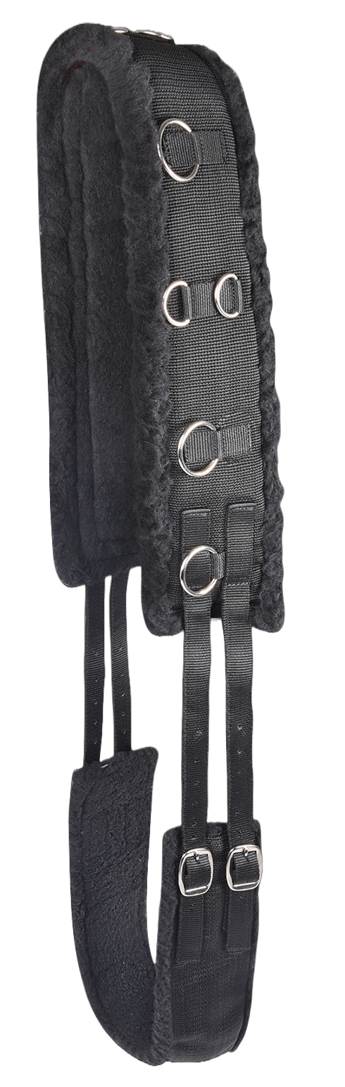 Lunging surcingle made of sturdy polypropylene, softly lined with teddy fleece. Features 12 rings for individual rein attachment.