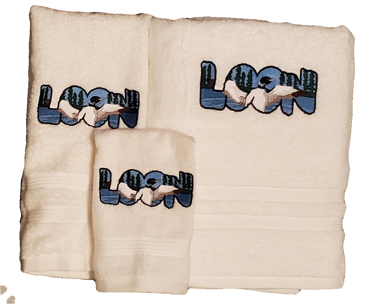 Custom embroidered bath towels featuring a flying loon within the word “Loon”. Designs are done on a soft, 100% cotton terry. Towels are a medium weight terry for best appearance of the embroidery. Designs are sewn in long lasting polyester thread.