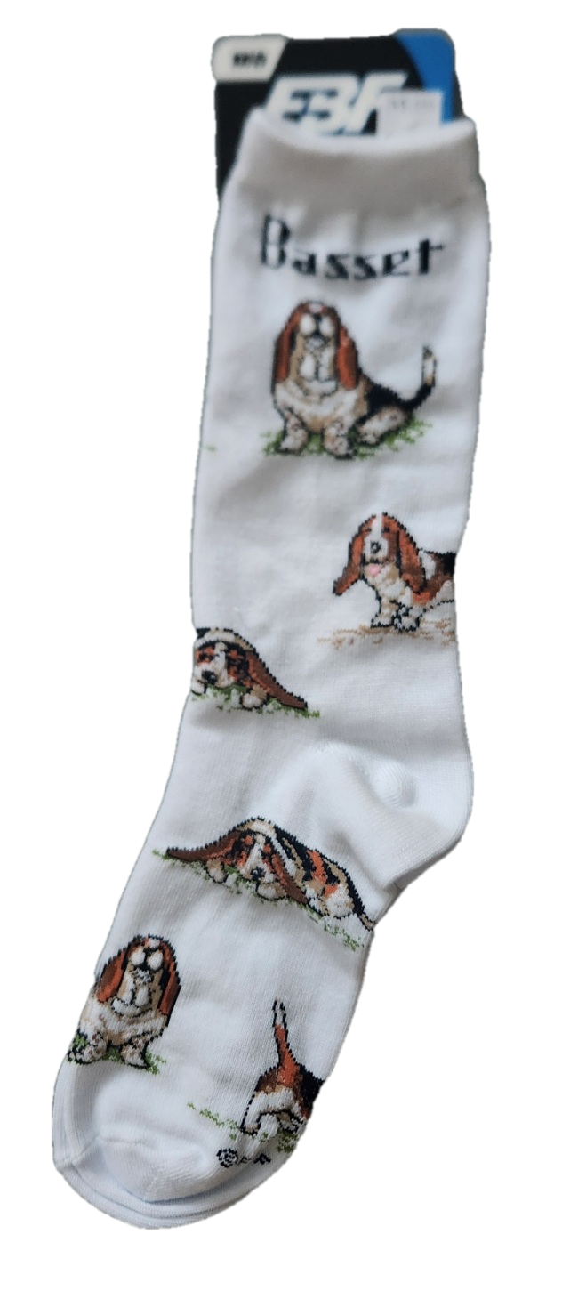 Socks are white with Basset dog poses. Knit in Graphics. Socks are 83% Acrylic, 14% Polyester, 2% Rubber, 1% Spandex. Elastic is Nylon, Latex Rubber. Made in Korea. Size Medium: Fits Women Shoe sizes 6-11, Men Shoe sizes 5-10
