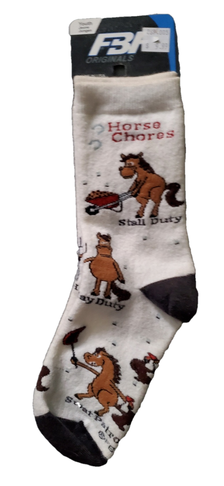 Socks are white with various horses doing chores and word “Horse Chores”. Knit in Graphics. Socks are 76% Polyester, 21% Stretch Nylon, 2% Spandex, 1% Rubber. Elastic is Nylon, Latex Rubber. Made in USA. Size Medium: Fits Women Shoe sizes 6-11, Men Shoe sizes 5-10. Size Junior is size 13 and 1-5.