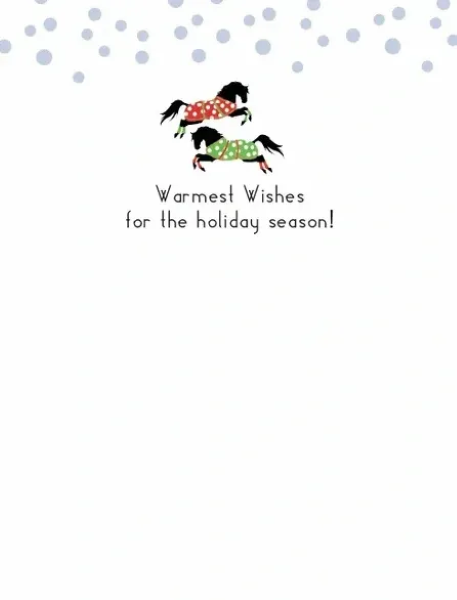 The box of 8 cards and envelopes have two black galloping horses with the words “Frolicking all the way home” on the front. On the inside says “Warmest Wishes for the Holiday Season”. Actual size of the cards are 4 1/2″ x 6″.