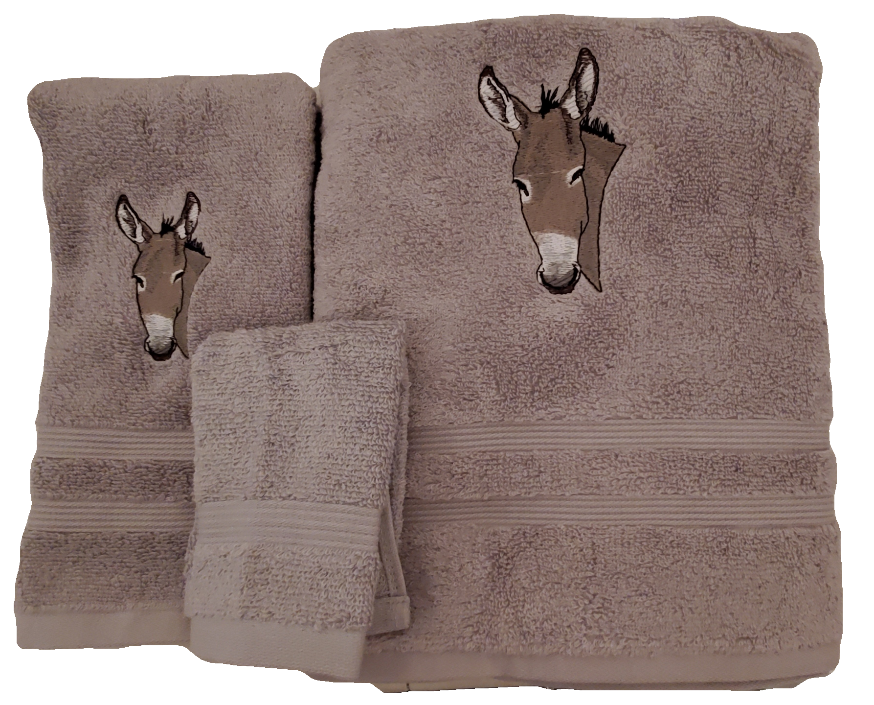 Embroidered bath towels featuring an embroidered Gray Donkey On. Designs are done on a soft, 100% cotton terry. Towels are a medium weight terry for best appearance of the embroidery. Designs are sewn in long lasting polyester thread.